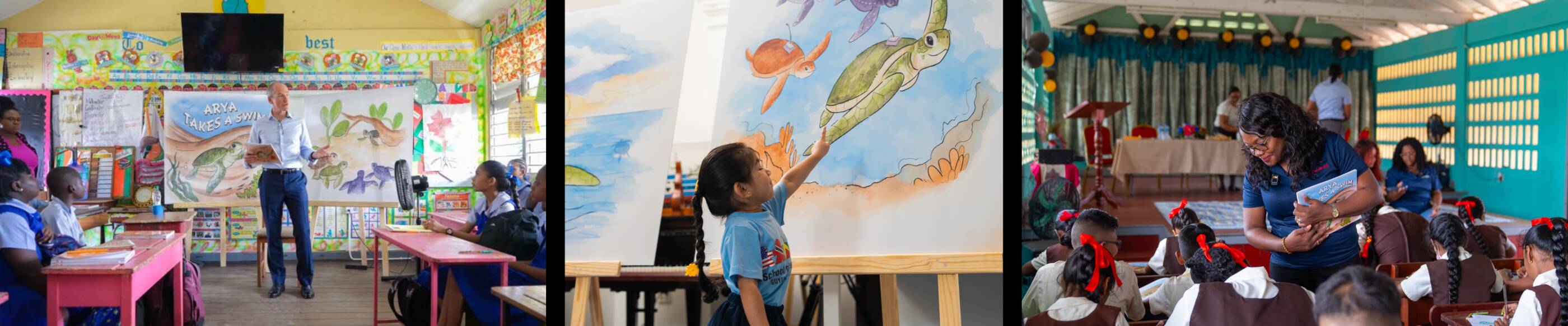 We partnered with Environmental Management Consultants Guyana (EMC) to bring this story to life. On World Turtle Day, we celebrated by distributing over 12,000 copies of the book to 500 primary schools across Guyana. Alistair Routledge, Lead Country Manager of Guyana, shared Arya’s journey with a class of excited students.